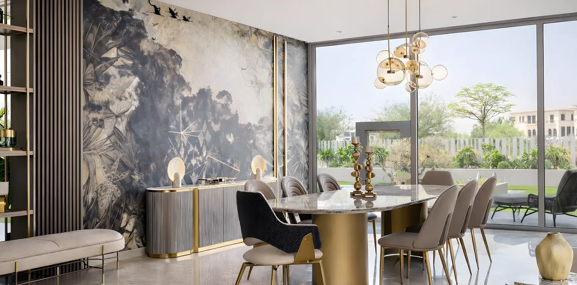 Within the living and dining areas, a sculptural TV unit with steel champagne detailing extends into a bookshelf. Leather seating with metal accents grounds the environment.